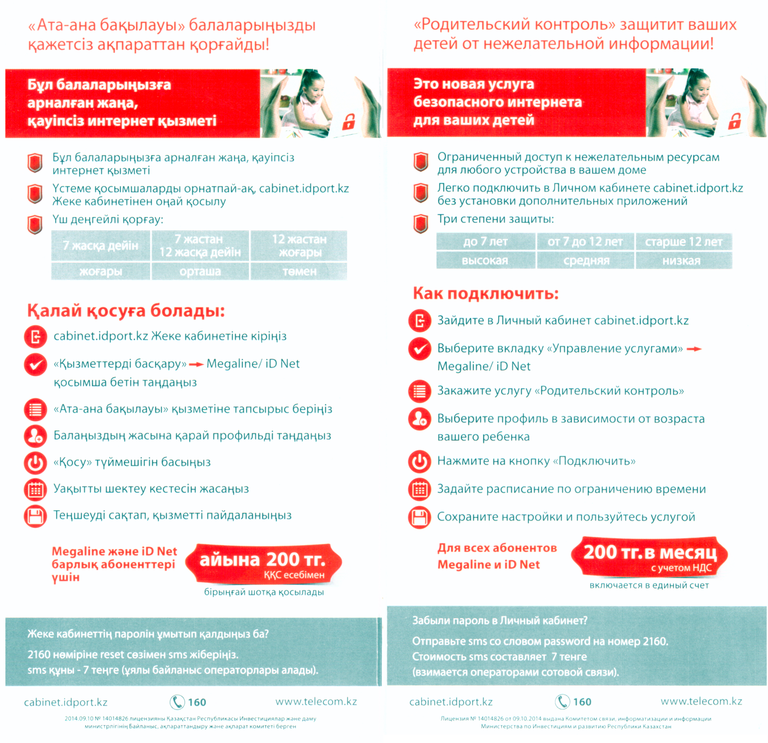 Компания АО "Казактелеком" предлагает для всех абонентов Megaline и ID Net новую услугу "Родительский контроль", безопасный интернет для ваших детей.